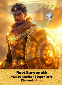 Ravi carries the golden heart of a lion and the unshakable will of a warrior-king. Fueled by the blazing fire of Valor, he shines brightest in moments of danger, rallying others with fierce bravery. His courage isn’t just strength, it’s a spark that awakens the hero within anyone who follows him.