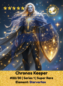 Chronos Keeper bends time like light, weaving stars into shields and moments into power. A guardian of destiny, he moves with celestial grace, guiding others through chaos with the steady pull of a vortex that never forgets its purpose.age, igniting hope in even the darkest skies.