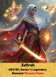 Zafirah walks with the fire of rebirth. Her sword glows with ancient flame, and her lantern carries the warmth of second chances. In every step, she offers renewal, reminding the fallen they can always rise stronger, brighter, and more whole.