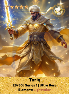 Tariq rises with the brilliance of justice, his blade alight with unwavering purpose. Drawing strength from truth and honor, he leads with a heart full of conviction, cutting through fear and falsehood to inspire courage in all who follow.