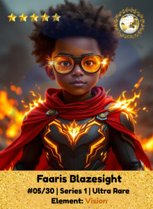 Faaris sees more than the world allows. His eyes blaze with a power called Vision, a gift that reveals truth, future, and hidden strength in others. Though young, he guides his team through darkness with insight that outshines age. Every spark in his gaze holds a path forward.
